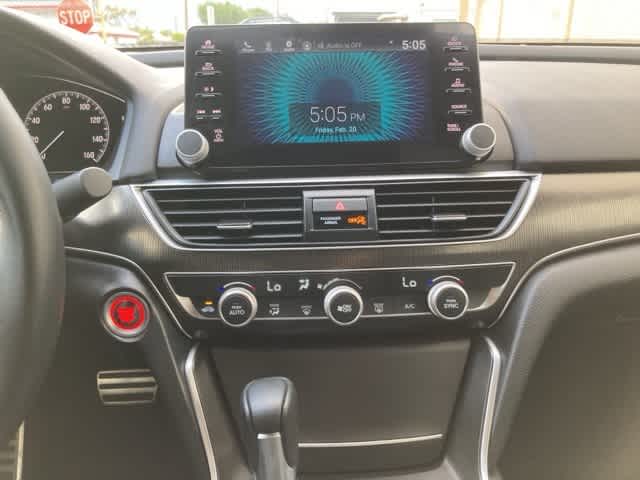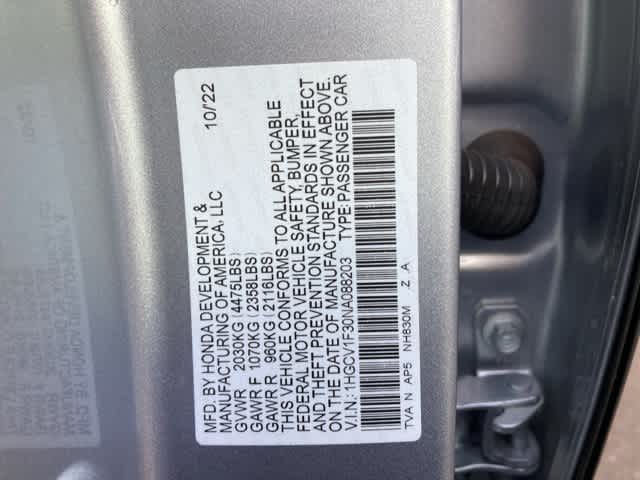 Blk/Black Artificial Leather, 4-Wheel Disc Brakes, 8 Speakers, ABS brakes, Adaptive Cruise Control: Adaptive Cruise Control (ACC) with Low-Speed Follow, Air Conditioning, Alloy wheels, AM/FM radio, Apple CarPlay/Android Auto, Auto High-beam Headlights, Automatic temperature control, Brake assist, Bumpers: body-color, Delay-off headlights, Driver door bin, Driver vanity mirror, Dual front impact airbags, Dual front side impact airbags, Electronic Stability Control, Emergency communication system: HondaLink, Exterior Parking Camera Rear, Fabric w/Synthetic Leather Seat Trim, Forward collision: Collision Mitigation Braking System (CMBS) + FCW mitigation, Four wheel independent suspension, Front anti-roll bar, Front Bucket Seats, Front Center Armrest, Front dual zone A/C, Front fog lights, Front reading lights, Fully automatic headlights, Illuminated entry, Knee airbag, Lane Departure Warning System, Leather Shift Knob, Leather steering wheel, Low tire pressure warning, Occupant sensing airbag, Outside temperature display, Overhead airbag, Overhead console, Panic alarm, Passenger door bin, Passenger vanity mirror, Power door mirrors, Power driver seat, Power steering, Power windows, Radio data system, Radio: 180-Watt AM/FM Audio System, Rear anti-roll bar, Rear seat center armrest, Rear window defroster, Remote keyless entry, Security system, Speed control, Speed-sensing steering, Speed-Sensitive Wipers, Split folding rear seat, Spoiler, Steering wheel mounted audio controls, Tachometer, Telescoping steering wheel, Tilt steering wheel, Traction control, Trip computer, Variably intermittent wipers, Wheels: 19 Machine-Finished Alloy w/Black Inserts, Blk/Black Artificial Leather.