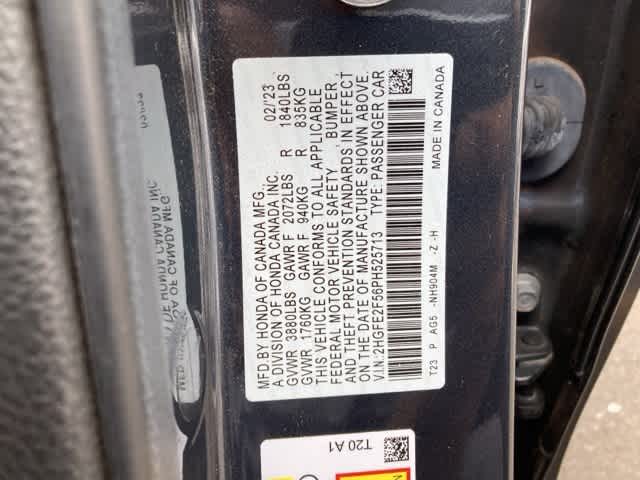 HondaTrue Certified Certified, Blk/Black Cloth, 4-Wheel Disc Brakes, 8 Speakers, ABS brakes, Adaptive Cruise Control: Adaptive Cruise Control (ACC) with Low-Speed Follow, Air Conditioning, Alloy wheels, AM/FM radio, Apple CarPlay/Android Auto, Auto High-beam Headlights, Automatic temperature control, Brake assist, Bumpers: body-color, Cloth Seat Trim, Delay-off headlights, Driver door bin, Driver vanity mirror, Dual front impact airbags, Dual front side impact airbags, Electronic Stability Control, Emergency communication system: HondaLink, Exterior Parking Camera Rear, Four wheel independent suspension, Front anti-roll bar, Front Bucket Seats, Front Center Armrest, Front reading lights, Fully automatic headlights, Illuminated entry, Knee airbag, Leather Shift Knob, Leather steering wheel, Low tire pressure warning, Occupant sensing airbag, Outside temperature display, Overhead airbag, Panic alarm, Passenger door bin, Passenger vanity mirror, Power door mirrors, Power steering, Power windows, Radio data system, Radio: 180-Watt Audio System w/8 Speakers, Rear anti-roll bar, Rear side impact airbag, Rear window defroster, Remote keyless entry, Security system, Speed control, Speed-sensing steering, Steering wheel mounted audio controls, Tachometer, Telescoping steering wheel, Tilt steering wheel, Traction control, Trip computer, Wheels: 18 Gloss Black Alloy, Blk/Black Cloth.