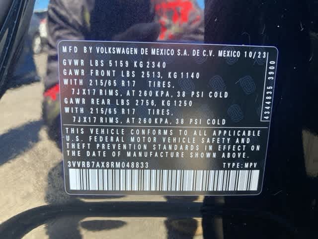 3.33 Axle Ratio, 3rd row seats: bench, 4-Wheel Disc Brakes, 4-Wheel Independent Suspension, 6 Speakers, ABS brakes, Air Conditioning, Alloy wheels, AM/FM radio, Brake assist, Bumpers: body-color, Cloth Seating Surfaces, Compass, Delay-off headlights, Driver door bin, Driver vanity mirror, Dual front impact airbags, Dual front side impact airbags, Electronic Stability Control, Emergency communication system: VW Car-Net Safe & Secure 5-year, Exterior Parking Camera Rear, Four wheel independent suspension, Front anti-roll bar, Front Bucket Seats, Front Center Armrest, Front reading lights, Fully automatic headlights, Heated door mirrors, Heated Front Seats, Heated front seats, Illuminated entry, Leather Shift Knob, Low tire pressure warning, Occupant sensing airbag, Outside temperature display, Overhead airbag, Overhead console, Panic alarm, Passenger door bin, Passenger vanity mirror, Power door mirrors, Power steering, Power windows, Radio data system, Rain sensing wipers, Rear anti-roll bar, Rear reading lights, Rear seat center armrest, Rear window defroster, Rear window wiper, Remote keyless entry, Speed control, Speed-sensing steering, Split folding rear seat, Spoiler, Steering wheel mounted audio controls, Tachometer, Telescoping steering wheel, Tilt steering wheel, Traction control, Trip computer, Turn signal indicator mirrors, Variably intermittent wipers, Wheels: 17 2-Tone Machined Twin 5-Spoke Alloy.